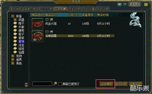 不仅如此,玩家还可以点击界面中的试用按钮,此商品添加到奇宝斋的试用界面中。在该页面道友可以查看或删除目前已试用的商品。试用方式为,玩家进入游戏的九重天区组区组中,与NPC“九重天仙官”沟通并缴纳200,000文钱,即可领取该试用商品60分钟。为方便体验,在九重天试用的商品会补充寿命、忠诚度、灵气、耐久度、风灵丸,装备的加点属性要求会降至1点。