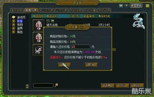 买家发起还价后,该还价有效时间为24小时,可在我的收藏列表处查看。如卖家未在24小时内同意还价,则默认卖家拒绝还价,担保金可全额退回;若买家主动撤销还价、卖家拒绝还价或者商品信息失效的情况下,担保金也将会全额退回。目前,系统已经在无双倾城、五福临门、钱塘观潮、1心1意这四个公测区组开启此功能进行尝试,其他区组的开启时间待定,各位道友期待一下吧!