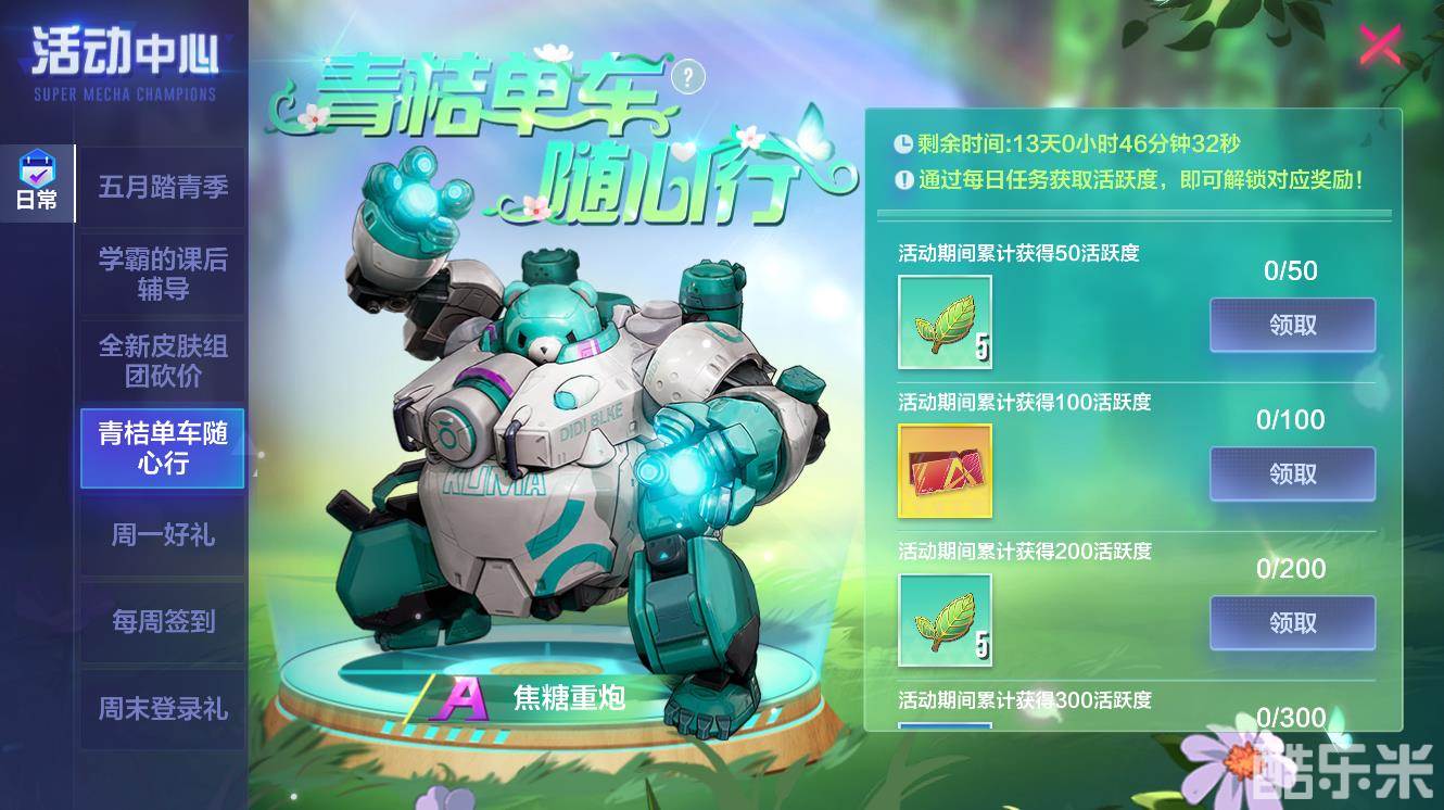 活动期间完成活动任务,收集绿意徽章,就可以免费兑换机甲和驾驶员。每日任务积累活跃度,达到指定数量后还可以免费解锁青桔单车联动皮肤——焦糖重炮?青桔!
