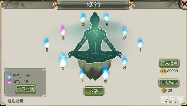 6、每次运功随机产生10个不同数量的汽云。可通过点击高人指点和仙人指点提升汽云中的数值。高人指点可以使每个汽云随机增加1~8的数值,仙人指点可使所有汽云达到最大值21。