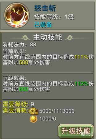 怒击斩可对前方直线范围内的目标造成百分比伤害并附加固定值伤害。