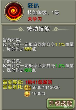学习狂热后,神将每次攻击都有一定概率回复自身血量,并在攻击中附加额外伤害。
