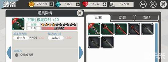 高等级的装备还可以镶嵌魂魄石,可以提高更多的属性。如果在装备抽奖、挑战模式或者关卡中获得一件套装的白装,例如极魔套装,只需要将它强化到+10强化按钮就会变成进化按钮,点击进化即可升一星。