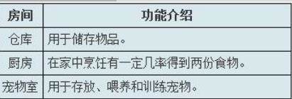 房屋可以由玩家随意划分功能房间,房间包括仓库、卧室、厨房、宠物室、佣人房五种。每个房间分别有普通、中级、高级三个级别,高级的房间能更好地发挥该房间的功能。以下是五种房间的功能介绍:
