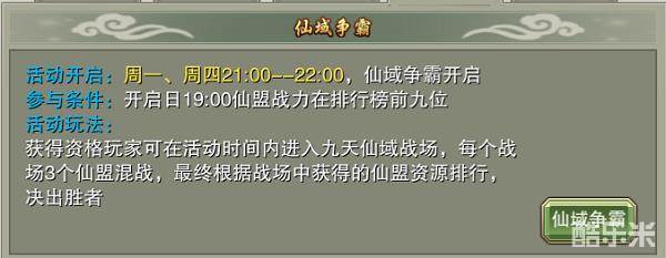 1、每周一、周四的19点时,战力排行前9名的仙盟自动获得参赛资格。