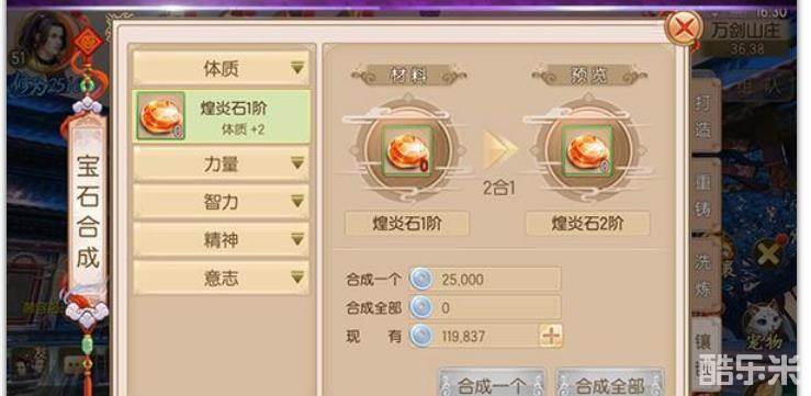 玩家可以通过宝石合成系统获得等级更高的宝石,2颗低阶宝石合成后变为1颗宝石,等级提升一阶。