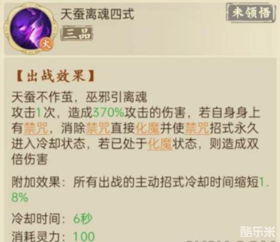 前期相对好用的过渡小组合,1、2号位分别释放魔入幽冥和天蚕离魂,立即进入入魔时间,并且打出一点小控制,玉索倒悬7号位进行入魔时间为基础的伤害加成结算。