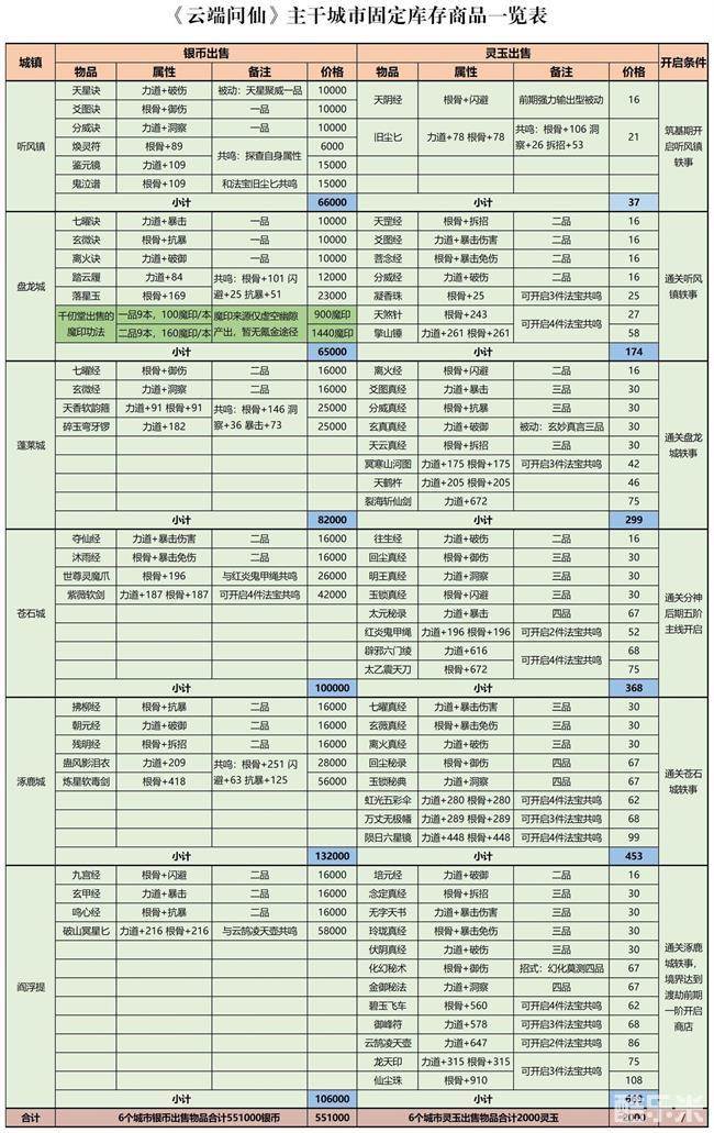 主线和轶事开启的城市主要以功法、灵宝和日刷新库存为主,是我们主要的关注点,资料片开启的城市出售物品均为灵玉售卖的资源消耗类物品。