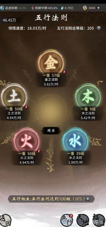 由图可见,每项五行法则都有达到各个50级领悟速度赔率*2的效果,那么,最优先吃资源要达到的,就是先开启一种法则至50层,而后转向另一项法则,五项法则全部50后,再按套路开启一轮150层的点法,也即是平均分配法