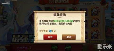 4、玩家累积充值额度达到1000/2000/5000钻石时,均可获得1次补签机会;