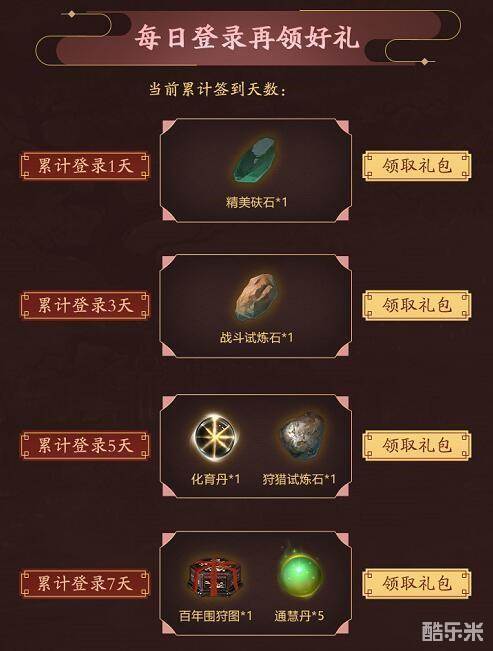 活动期间每日登录后即可在活动页面领取相应累计登录礼包。