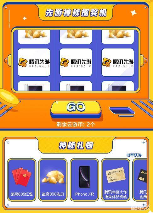使用云游币点击活动页面“GO”即可抽取神秘礼物,当摇奖机停止转动,三列转盘均显示同一礼品时,即可获得相应好礼!更有机会可获得最高888红包、iPhone和iPad等大奖!赶紧来试试手气吧!
