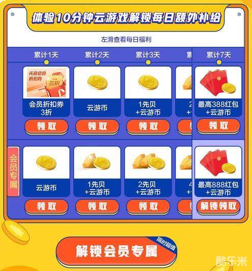 每天体验10分钟云游戏即可解锁每日额外补给,累计天数越多奖励也越多。会员还有专属福利补给哦,且累计7天可最高获得888红包及额外云游币!