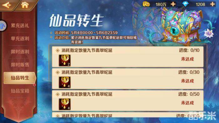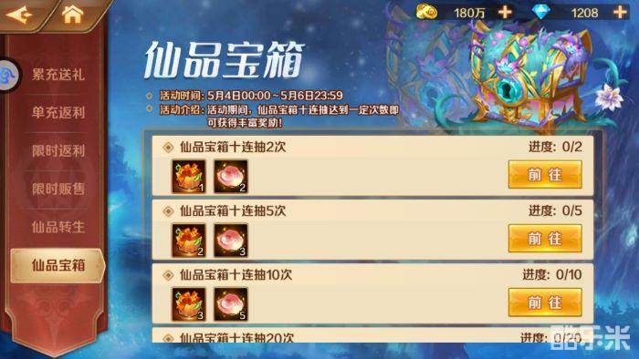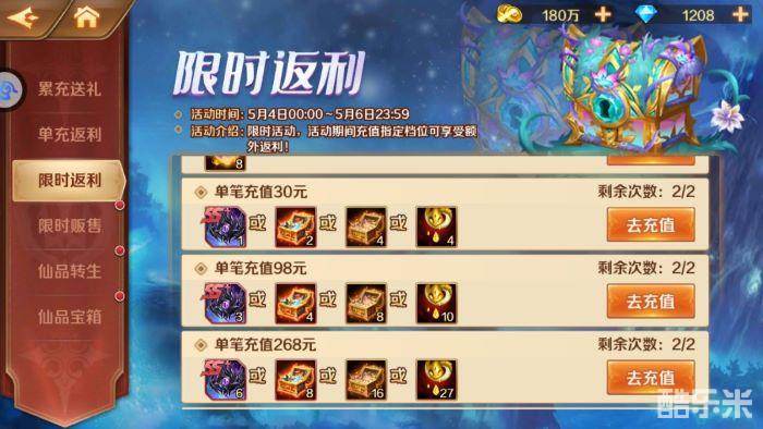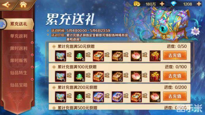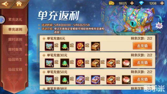 活动期间,参与单充、累充、限时返利活动,激活各档位后即可领取SS+仙品、SS+暗器、仙草精粹等珍贵资源!