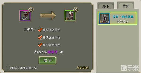 《修仙真人》装备继承功能可以在装备更换后,将原有装备的强化属性、洗炼属性、幸运属性转移到新装备上,但是镶崁的宝石不会转移过去,需要在原有装备拆下。