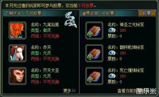 另外,在每个月20号至月末,当月充值超过1000元宝的玩家可以对下一期的可兑换奖励进行投票,决定下一期中万宝阁中的道具类型。投票结束时,系统将根据每一个道具下的选票数量,来确定下一期的可兑换的道具奖品。如果有的分类下有选票的道具数量不足3种,则系统将随机选择几种道具,补足3种道具。