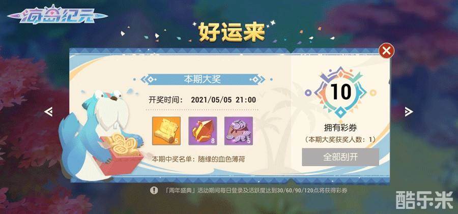 欢聚时刻就是热闹非凡,叫上朋友们,玩一盘「丛林乱斗」,趣味十足,还有可能收获意外奖励。听说这次周年盛典有欧皇大奖?来「好运来」拼拼欧气吧!在「周年盛典」活动期间,只要每日登录及活跃度达到30/60/90/120点,即可获得通向幸运大门的刮奖彩券。多轮开奖,奖券拿稳,说不定你就是下一个海岛锦鲤大王!