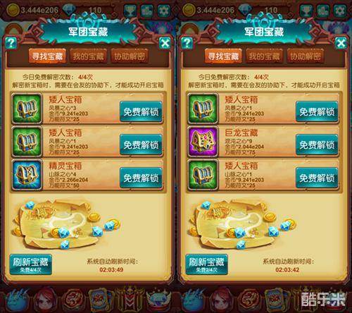 之后,勇者们想要获得大量金钱,那军团宝藏一定是大家最佳的选择!在公会中通过开启一个个宝藏,可以获得海量金钱,同时还可以获得万能符文与宠物进阶材料。对于驰骋在魔王大陆的勇者们来说,这三种资源都是不可或缺的。但是想要开启军团宝藏,一个人可是不行的,勇者们需要找寻其他小伙伴一同开启宝藏,只有这样才能成功开启宝藏,从中获得海量资源哦!