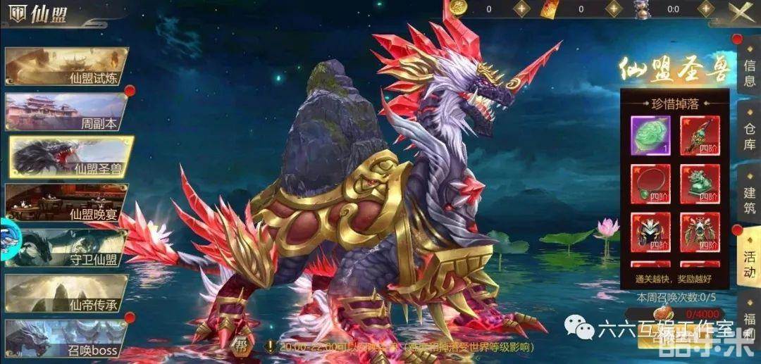 累计20000:真火圣龙*2、符文精华礼包*200、木槿花仙*4、超级外观宝箱*40、潜能灵力丹*800
