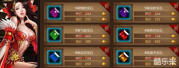 宝石分6种类型:道术、法防、法攻、气血、物防、物攻。宝石有10个等级,低级宝石可以合成高级宝石,等级越高,属性越高。