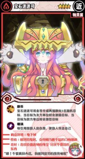 | 撒币 | 15 | 20s | 宝石迷迷可将金币分2拨撒向3名随机目标,当目标为友方单位时会激励目标获得 20%攻击力提升2秒,当目标为敌方单位会激怒目标, 吸引仇恨2秒,并造成80%伤害。 |