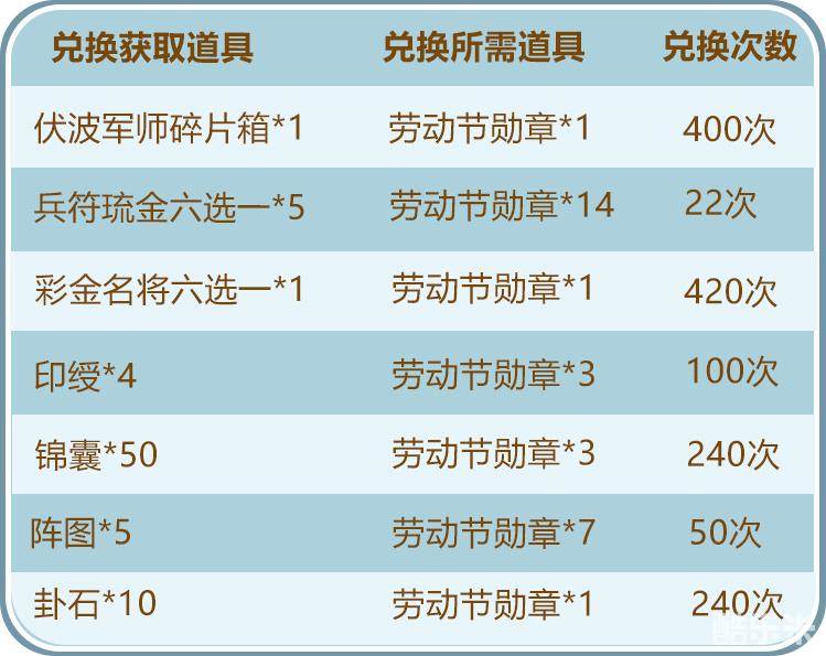 「劳动节勋章」可用来兑换伏波军师碎片箱、兵符琉金六选一等稀有资源: