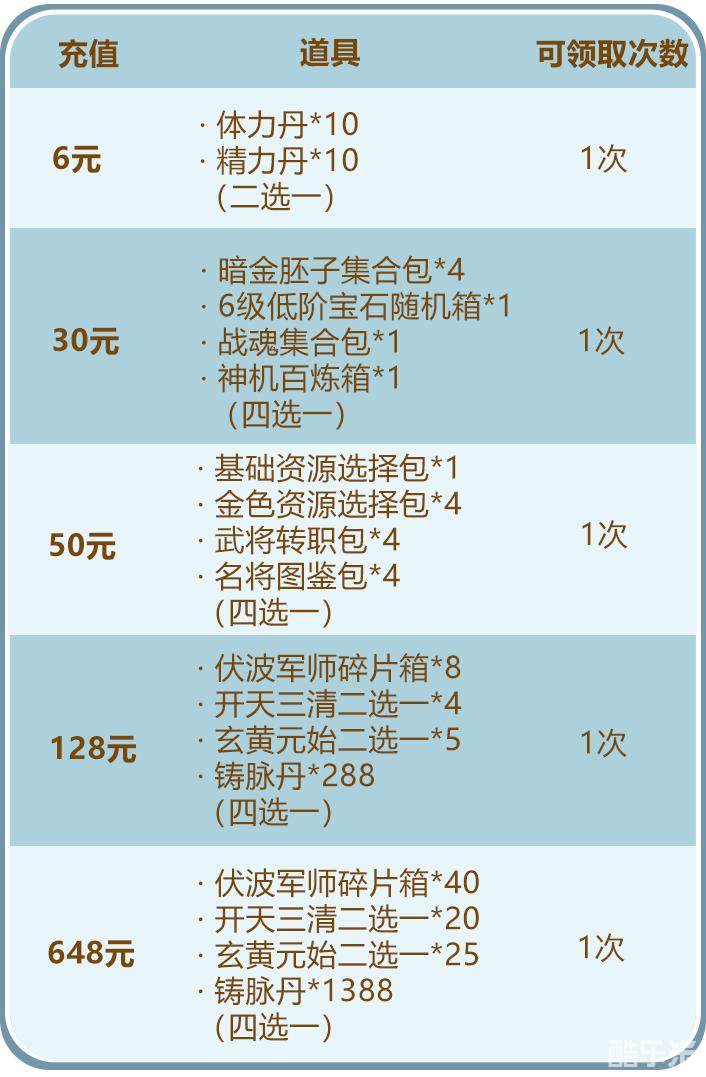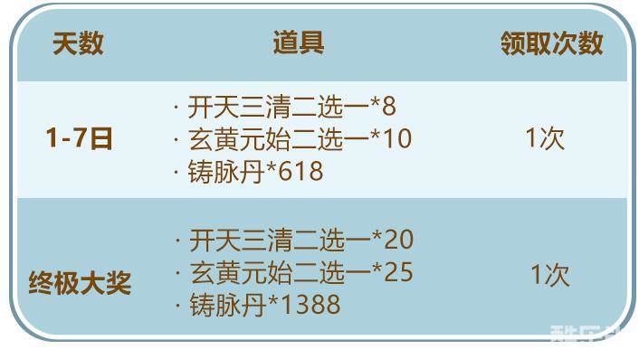 1-7日可领取:「开天三清二选一*8」 或 「玄黄元始二选一」*10 或「铸脉丹」*618