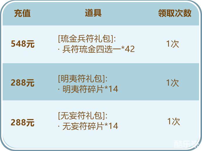 少年们单笔充值指定金额,即可得到明夷符碎片、无妄符碎片、兵符琉金四选一等珍稀资源,少年们千万不要错过哟~