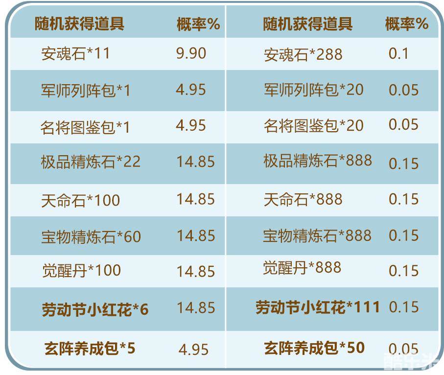 3.「劳动节礼盒」可开出:劳动节小红花*111、玄阵养成包*50、觉醒丹*888、天命石*888、极品精炼石*888、安魂石*666、军师列阵包*40、名将图鉴包*40、宝物精炼石*888、劳动节小红花*6、玄阵养成包*5、觉醒丹*100、天命石*100、极品精炼石*22、安魂石*11、军师列阵包*1、名将图鉴包*1、宝物精炼石*60中的随机1种。