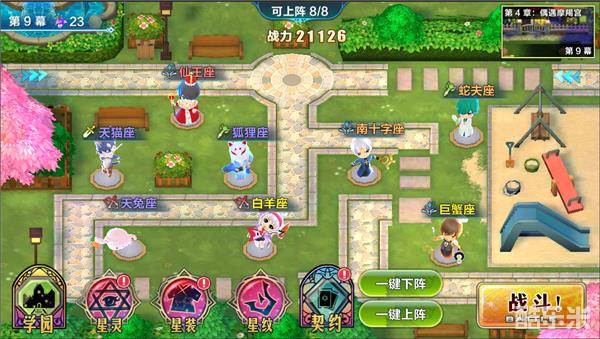 玩家可以从主界面点击守护入口,进入章节选择界面,选定章节后进入关卡选择界面,点击准备按钮后进入关卡的布阵界面。在布阵界面中,玩家可以对上阵的星灵进行操作,位置调整,调账完毕直接点击【战斗】就可以进入战斗了。闯关成功后可以结算获得闯关奖励,继续下一关守护。