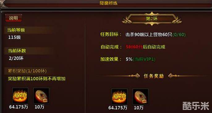 降魔修炼是一个自动跑环系统,玩家无需刻意完成,时间到达后会自动完成,每日可累积每日20环,满100环后不再增加奖励。