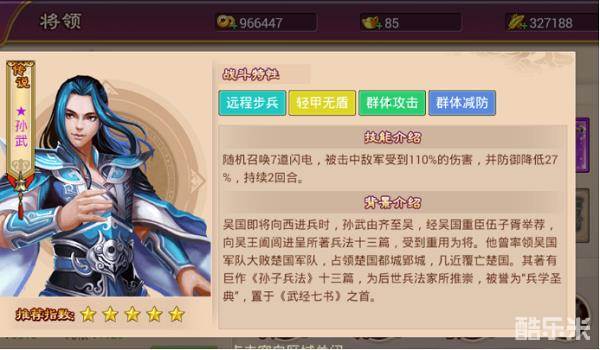 孙武在前后期都是很不错的将领,但是他的获取有点不好搞,但是他的初始速度很快。在出手钱就可以让对手损失很多兵力。还可以减少对面的防御是很不错的AOE输出。