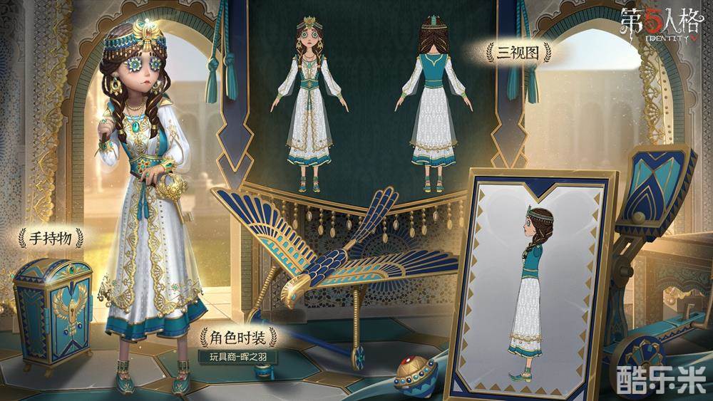 玩具商“晖之羽”身穿过膝长裙,明快鲜艳的配色和闪烁着微光的绿松石给人以清新又不失端庄之感;全身装饰着各种宝石与金饰,璀璨的光泽与精致的做工凸显了她的尊贵身份,别致的造型则展现着来自大漠彼端的异域风情;腰间别着一把巨大的金钥匙,这或许正是开启宝箱的关键一环;头戴华冠,流苏与璎珞衬出她的美丽,神鹰形装饰散发着金色光晕,象征着勇气与荣耀。