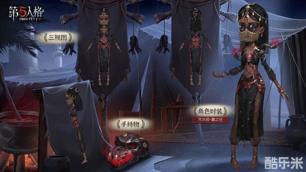为了得到珍宝的秘密,咒术师“噩之牙”情愿做一些小小的伪装——随行的侍女便是绝佳的选择。她以金色面纱遮挡脸庞,若隐若现让人难以看清;黑色上衣与半身裙别具风姿,充满异域风情;当阴谋揭开后,她也展露了专属于黑巫师的邪魅一面:黑蛇缠绕胳膊,每次吐息都喷出赤色光芒,金属光泽的鳞片覆盖腰间,裙摆上隐约可见黑色鳞片暗纹。