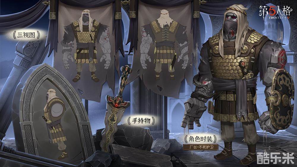 厂长“不死护卫”是一个沉重而有威慑力的石头巨人。不为自己存在的灵魂,早已无力判断现实的是非——他只听从号令者的吩咐。他身着金鳞重甲,坚硬的质地一定能抵御十分强力的攻击;破旧的布条几乎遮挡了整个头部,双眼散发着黯淡的红光;岩石般的躯体蕴含着无穷的力量,左臂缠绑着厚实的盾牌;黑蛇缠绕于右臂,嘴巴大张,獠牙和蛇信毕露,既是对敌人的威慑,也是对厂长-不死护卫自身的操控与命令。