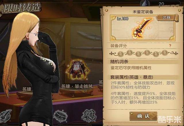 2件套的效果很一般,但4件套的效果却相当出彩,有5%的速度,还有全体技能的增伤。如果敌方目标少于4人,还能再提升一波伤害。很有PVP特点的一套装备,而且固定词条方面,除了武器,其他部位都有。