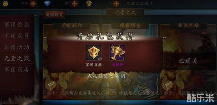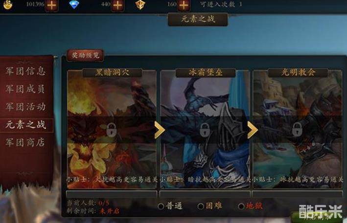 元素之战是军团专属战斗副本,你和你的军团成员们将在这里共同战斗,这里也是收获大量军团贡献和元素材料的好地方。