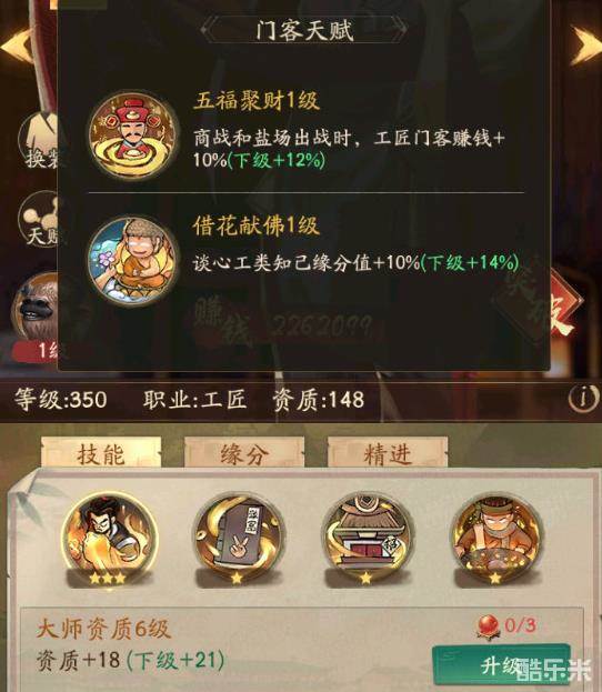 商战和盐场出战时,工匠门客赚钱+10%(下级+12%)