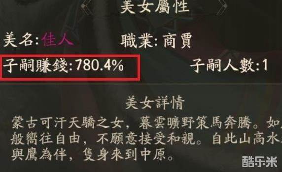 叫我大掌柜手游中,角色美女属性中的子嗣赚钱属性是受到多个因素影响的,主要如下: