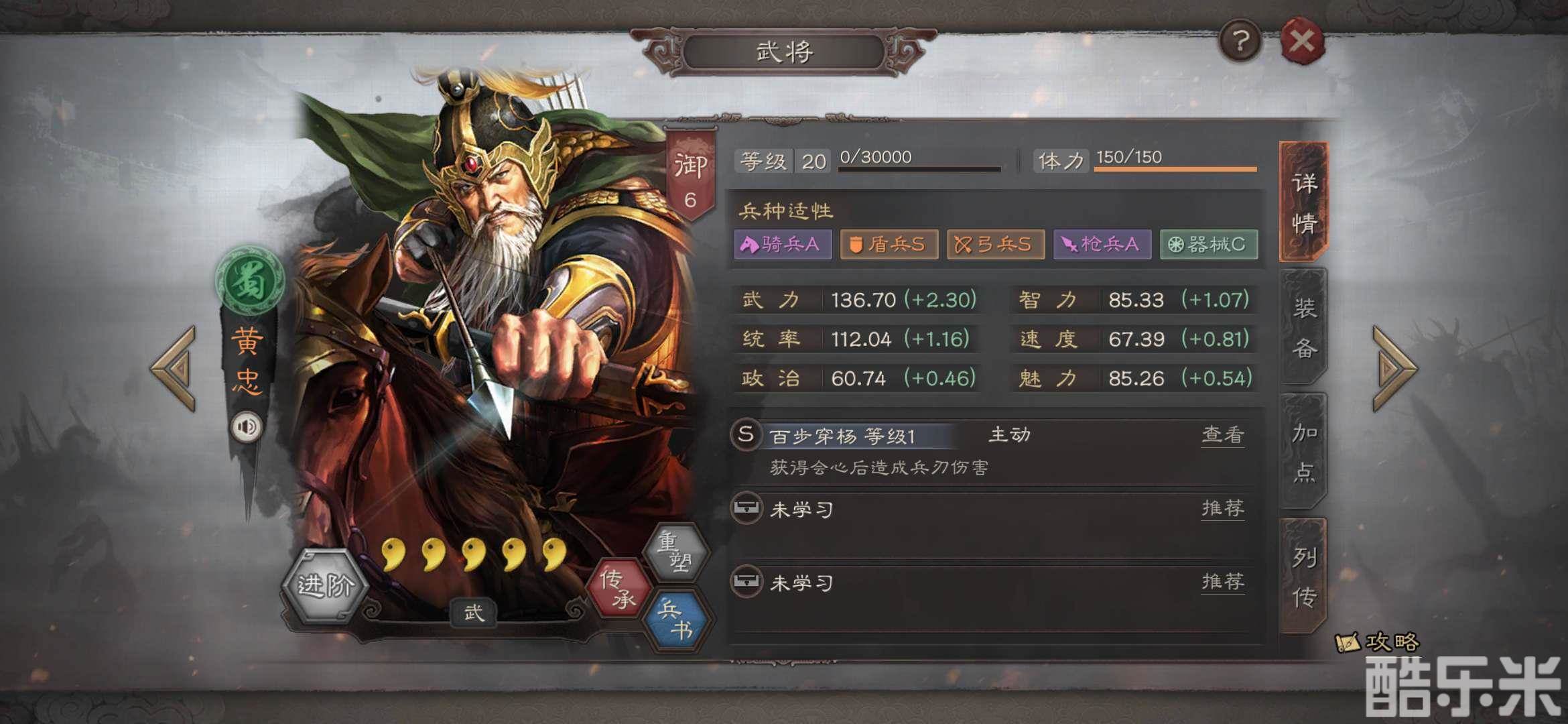 五虎枪,但是黄忠枪兵兵种适应性为A,又由于黄忠战法发动几率比较低,上白眉,提升下战法发动几率
