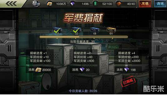 既然我们加入了军团,也就自然成为了战机世界中的一个大家庭,身为家庭成员,个人的贡献是必不可少的,在军费捐献系统中,有三种捐献可选择并且每天只能捐献一次,三种捐赠的区别不用我说,大家都是老司机也都知道当然是第三种捐赠对军团的贡献最大啦。根据捐赠的进度,每个人也会得到该进度的奖励,并且开启更多的军团功能。大家还是要根据个人的能力进行每日的捐献。