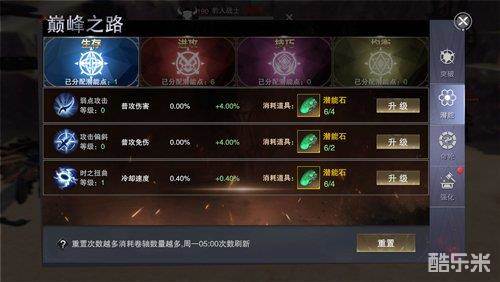 巅峰潜能分为生存、进攻、技巧和均衡4个板块,玩家可根据职业特效进行升级。生存天赋主要对普攻伤害、普攻免伤和冷却缩减等进行百分比加强,进攻天赋则侧重技能伤害,可提高技能的百分比伤害以及技能免伤,技巧天赋提升奥义伤害、奥义减伤和减益减免,均衡天赋则是提高PVP增伤、PVP免伤和治疗加成。