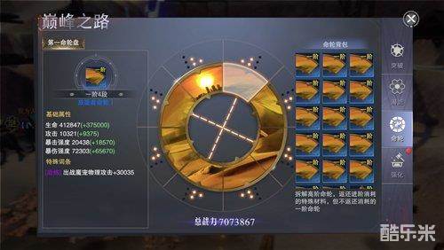 巅峰等级突破至3级,将开启巅峰装备——命轮。在进行突破符文的挑战任务时,都有几率获得命轮装备。命轮共有8个装备部件,同基础装备一样,可增加玩家生命值、攻击力、防御力、暴击爆伤、免暴抗暴、格挡和双方解除等属性。