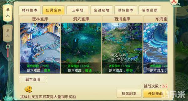 1、仙灵宝库副本,玩家可以在次副本获得大量的铜币,铜币用于提升技能等级和练体等级;