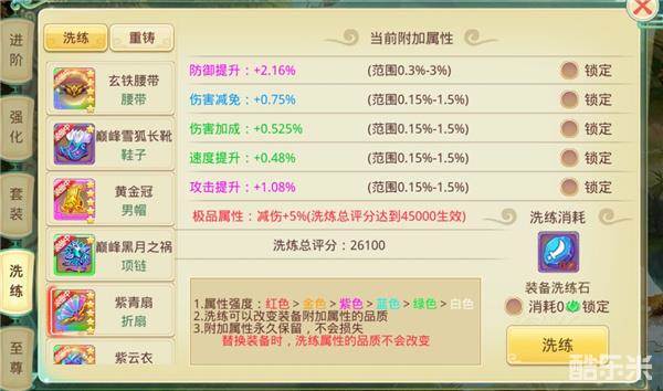 8、洗练功能处,玩家可以洗练已有的属性数值,也可以重铸已有的属性类型,洗练到红色属性时记得要锁定哦。