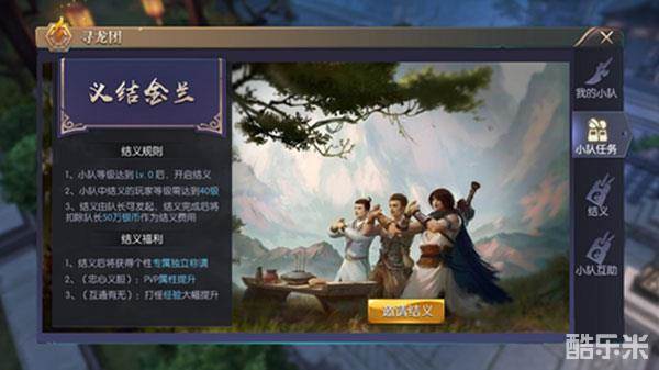 1、当寻龙团到达5级时。寻龙团成员之间可以进行结义。