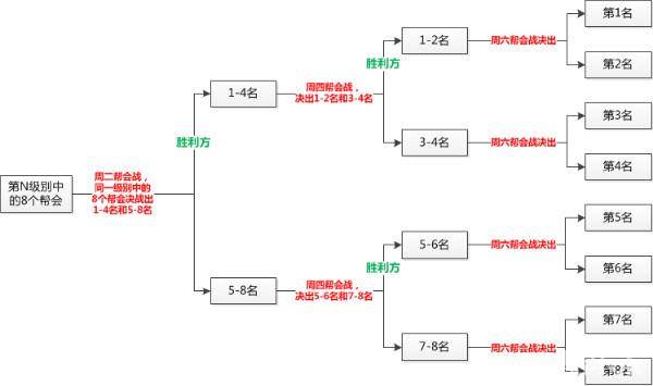 总规则:报名帮战中战斗力排名前64位的帮会参加,按照战斗力排名排序,每8个帮会一个级别,在周二、周四、周六三轮战斗中,决出该级别的1~8名