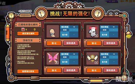 5月13日服务器维护后~5月27日服务器维护前玩家可以参与挑战!无限强化活动,点击强化按钮,会通过消耗燃料强化该道具,不同强化等级消耗燃料不同。强化成功提升强化等级时,根据强化等级可以获得对应的使用时间或者道具能力值。