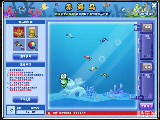 5月13日服务器维护后~5月27日服务器维护前玩家们可以参与养海马活动,免费获取VVIP、金色钥匙。海马需要吃虾米,完成场比赛即可获得虾米。点击鱼缸里的虾米时海马即可吃掉虾米。