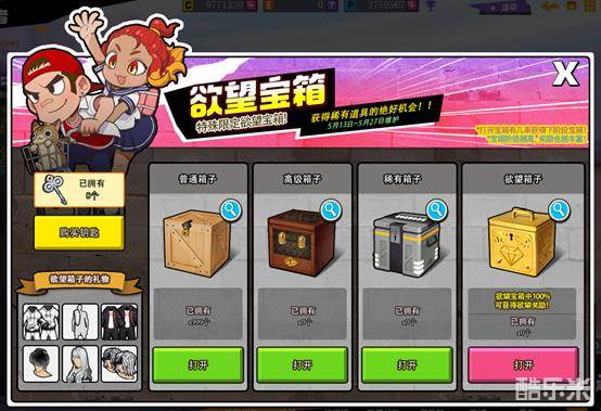 5月13日服务器维护后~5月27日服务器维护前玩家可以参与欲望宝箱活动,购买钥匙打开宝箱,打开宝箱有几率获得下阶段的宝箱。宝箱阶级越高奖励也越丰富。有机会获得各种稀有道具,包括黑色闪亮,公主长卷发等稀有。